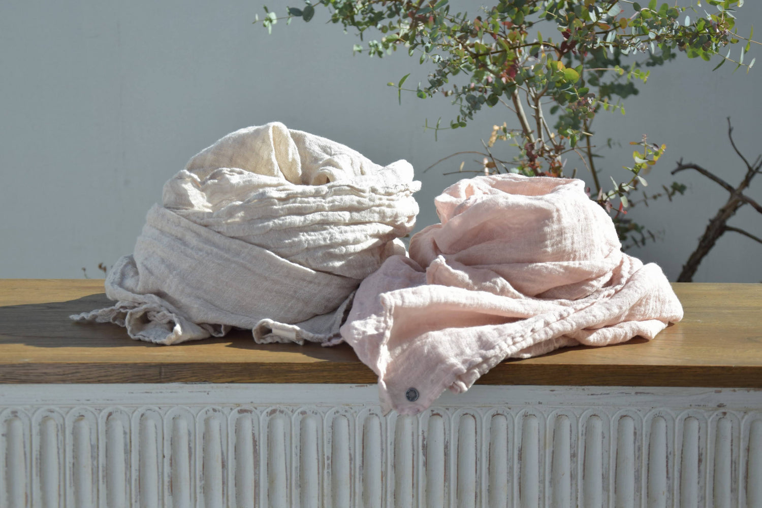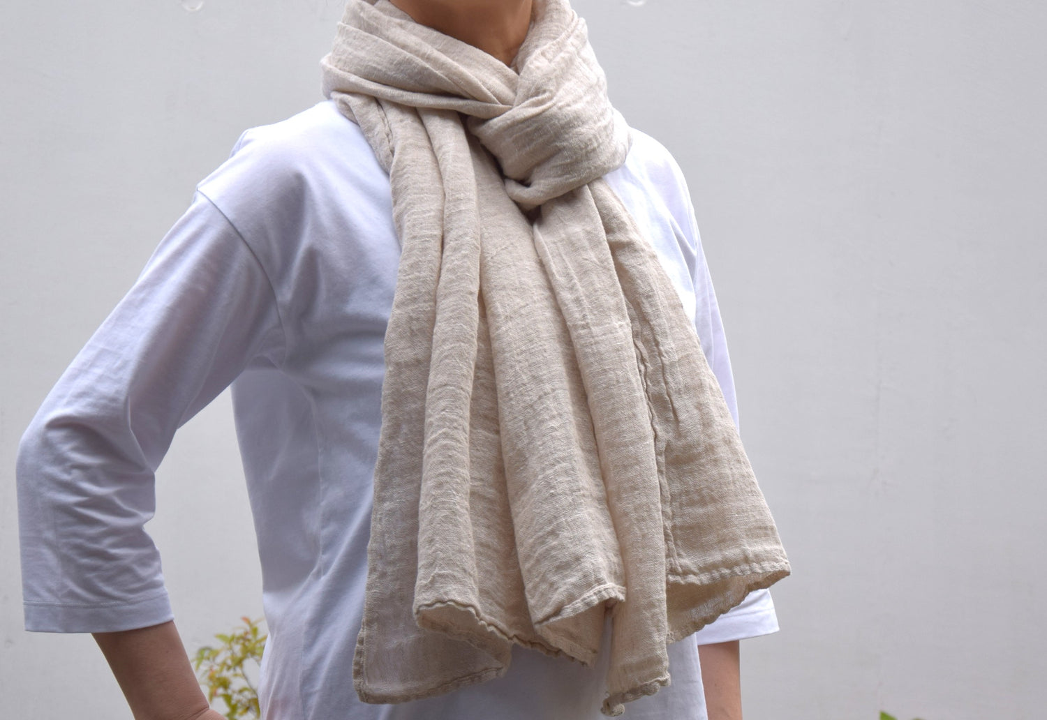 ヨーロッパ産リネンのみを使い、細い糸でふんわりと織り上げられた生地は、とてもやわらかです。また、空気を多く含むのでとても軽く、長時間首に巻いていてもとても快適です。 普段のお出掛けから、旅行にも最適です。 涼しい季節の防寒、日焼けの緩和、夏の冷房対策にと、1年を通して様々な使い方ができます。